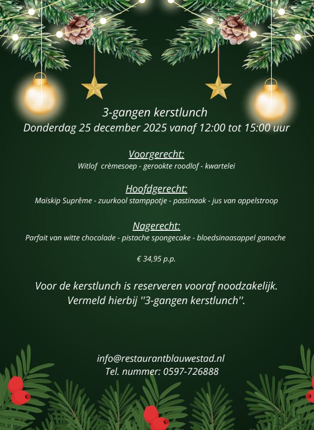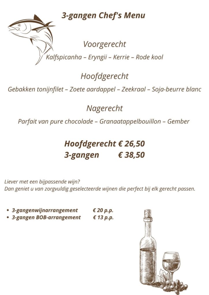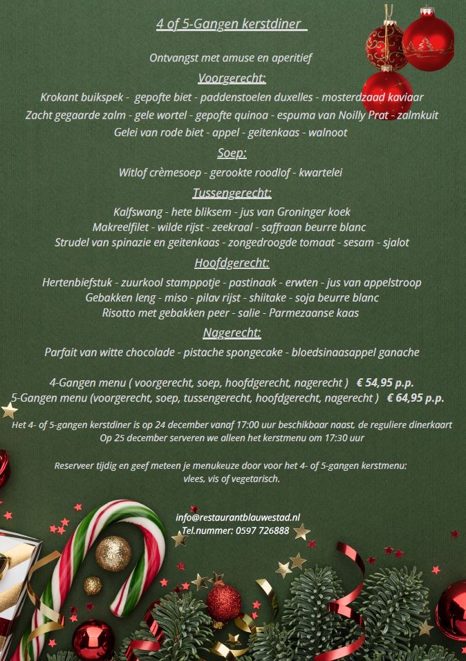 We bieden alles in verschillende arrangementen. Mail naar info@restaurantblauwestad.nl voor meer informatie.