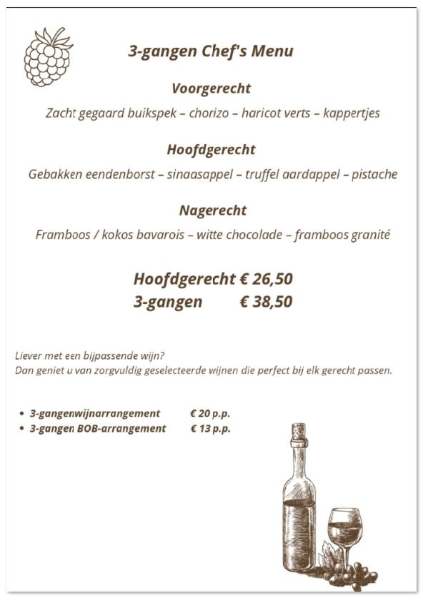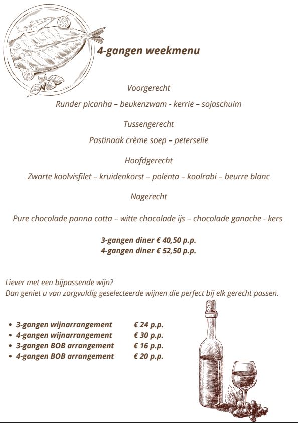 Voel u welkom om te genieten van lunch, diner, gebak of borrel. Onze kaart kenmerkt zich door heerlijke gerechten, met liefde en passie gemaakt van verse (streek)producten. Elke dag bieden wij vers door onze koks gemaakt gebak, wat heerlijk smaakt bij een kopje koffie.