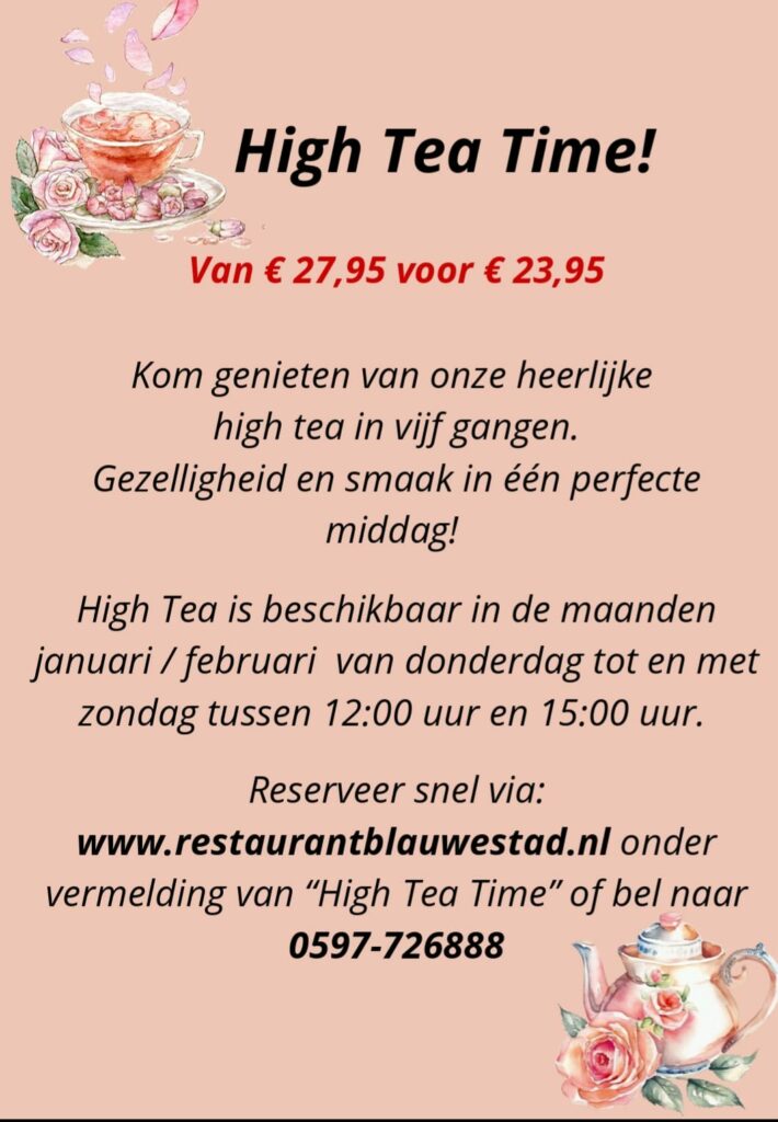 In de maand februari donderdag t/m zondag tussen 12:00 en 15:00 uur. Onze high tea serveren we in 5 gangen. Zo blijft alles lekker vers en heb je genoeg tijd om gezellig bij te kletsen met je gezelschap. Je geniet van unieke smaken van Eilles thee.